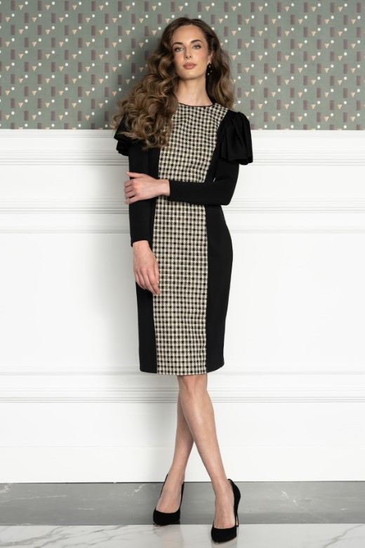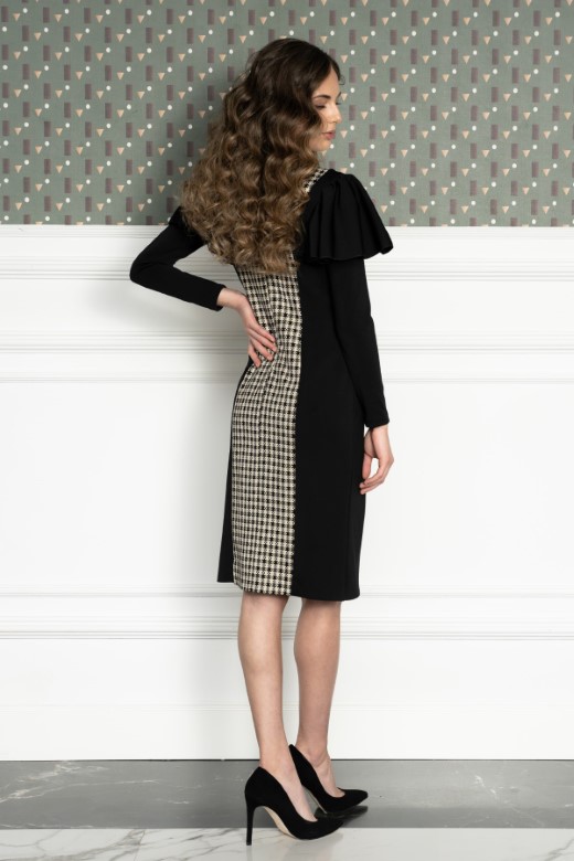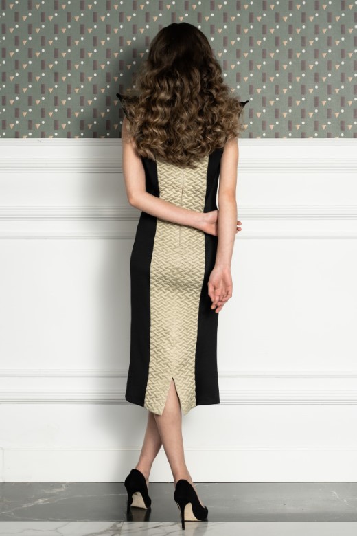 Vestido midi que combina elegancia y modernidad con un diseño bicolor que estiliza la silueta.
