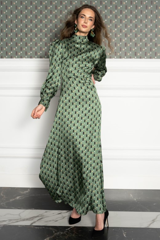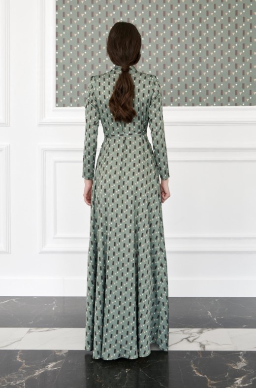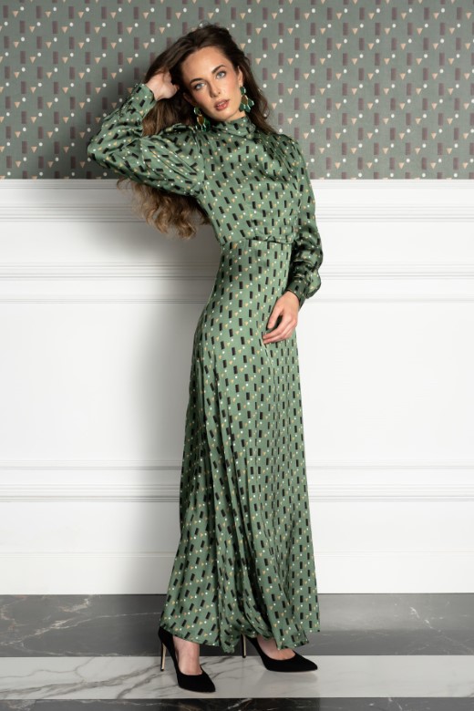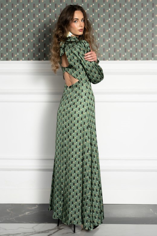Vestido largo de cuello alto con lazada que cae sobre la espalda.