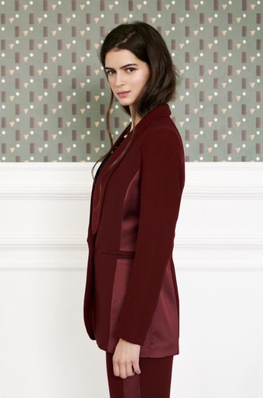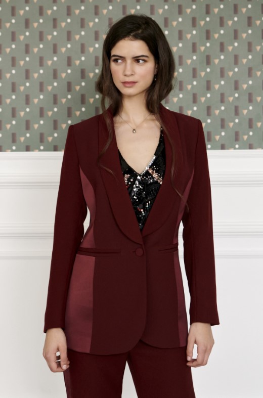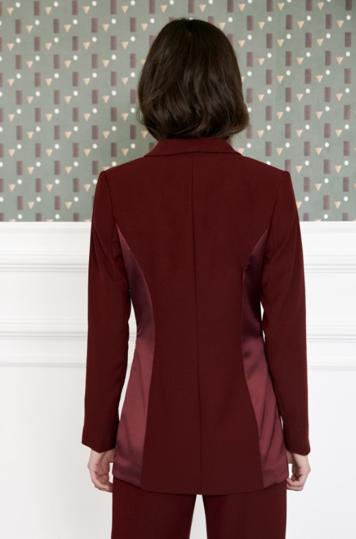 Chaqueta burdeos confeccionada en dos tejidos que aportan textura y estilo.