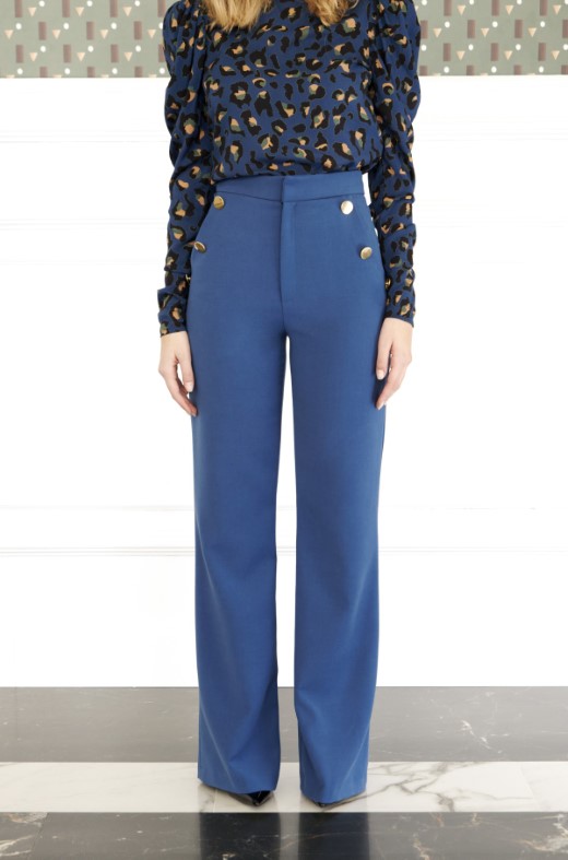 Detalles de botones dorados y bolsillos ribeteados en azul, que aportan un toque elegante y sofisticado al diseño.