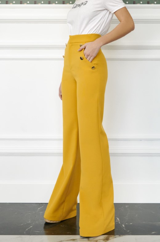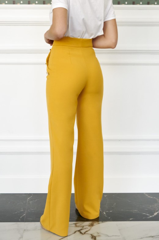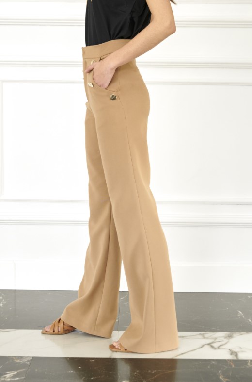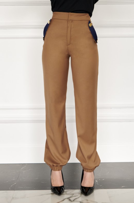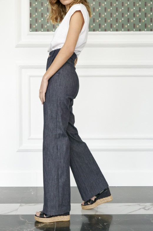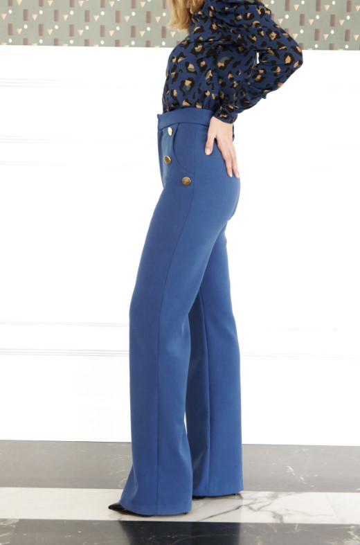 Detalle de vistas decoradas con botones "Lanuya" en bolsillos a contraste con el pantalón.