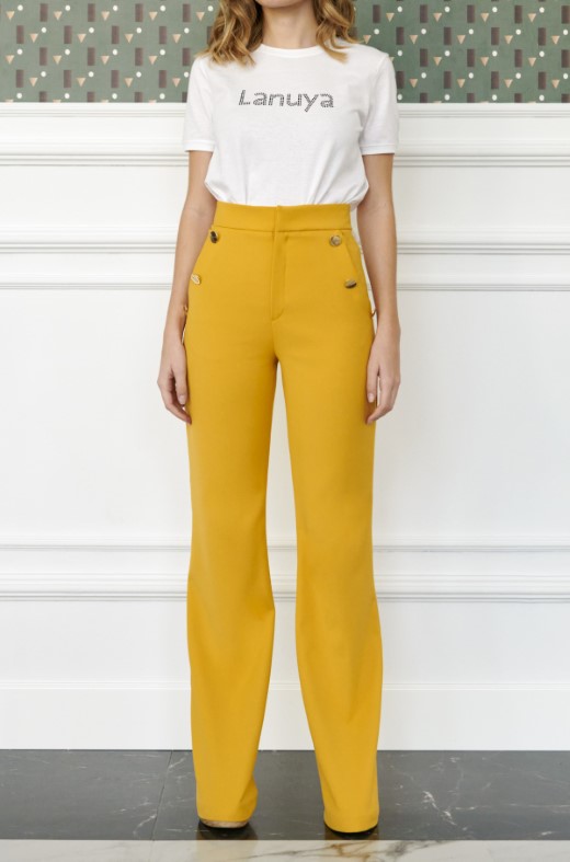 Pantalón de corte recto con cinturilla vista, bolsillos decorados con botones personalizados "lanuya" y bragueta con cierre de cremallera.