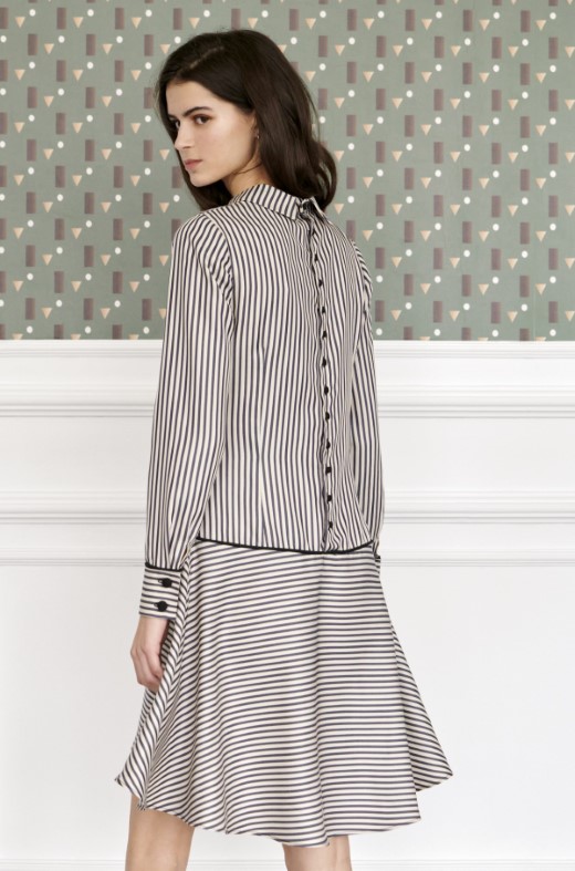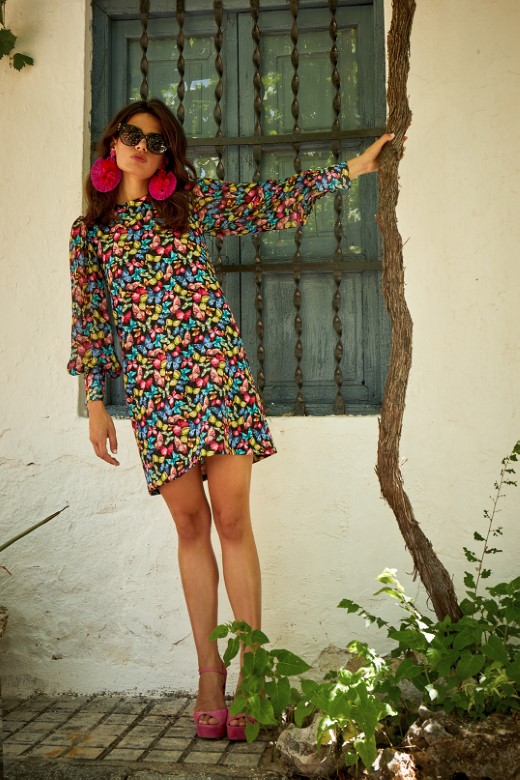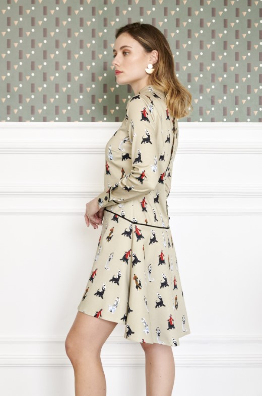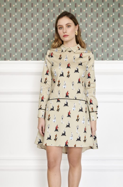 Vestido corto con cuello camisero y manga larga rematada con puño.