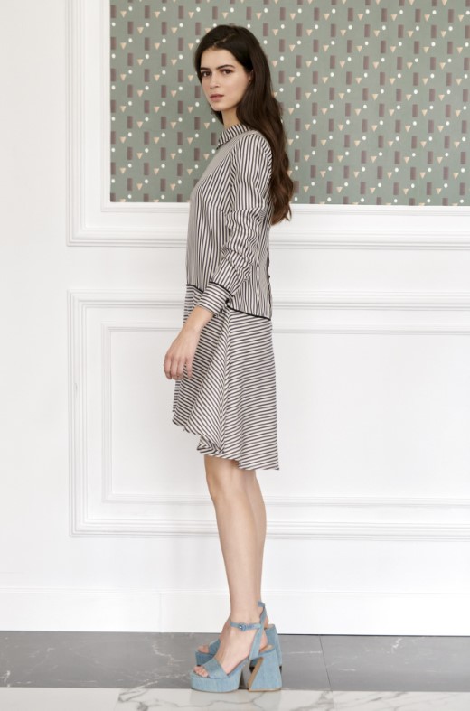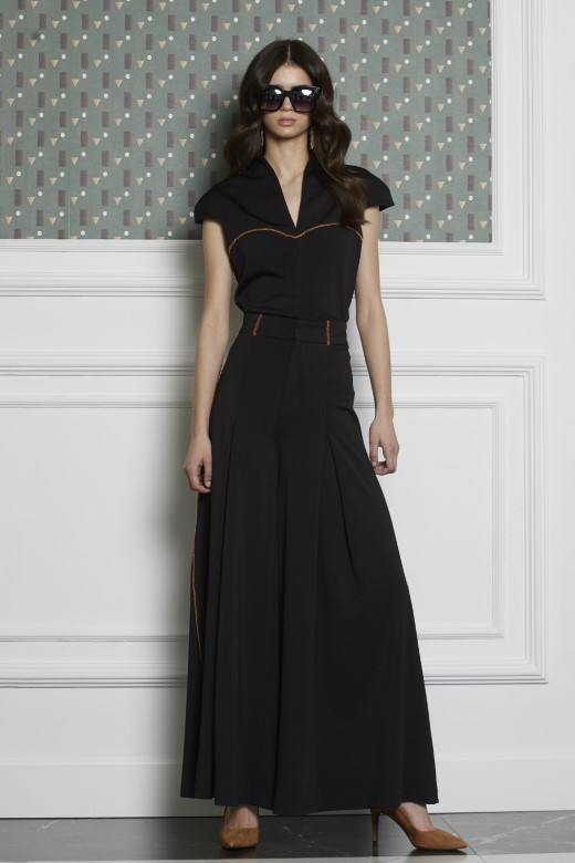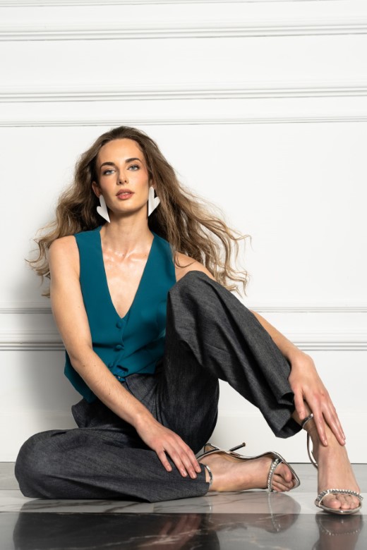 Su corte amplio y fluido, combinado con las pinzas frontales, crea una silueta favorecedora.