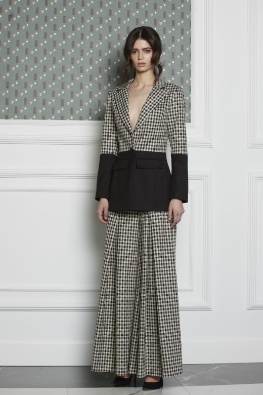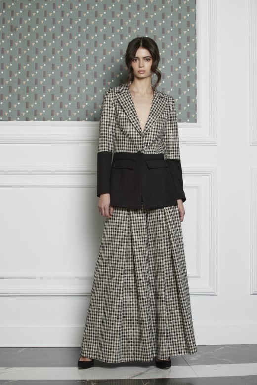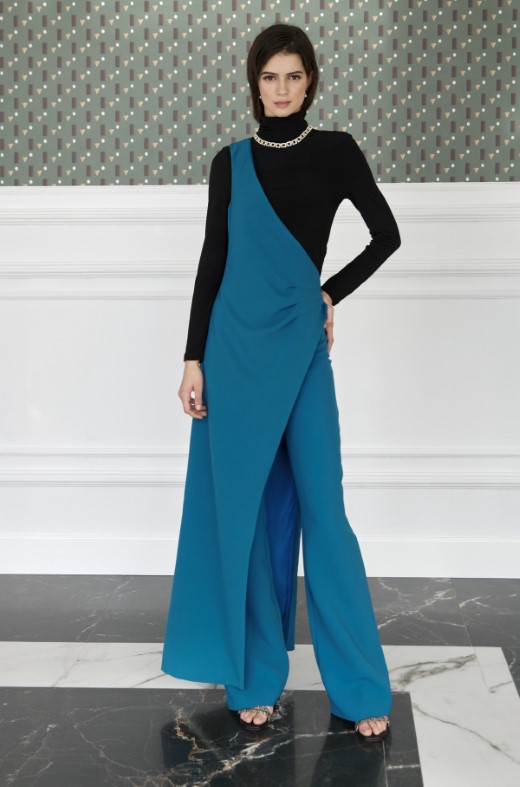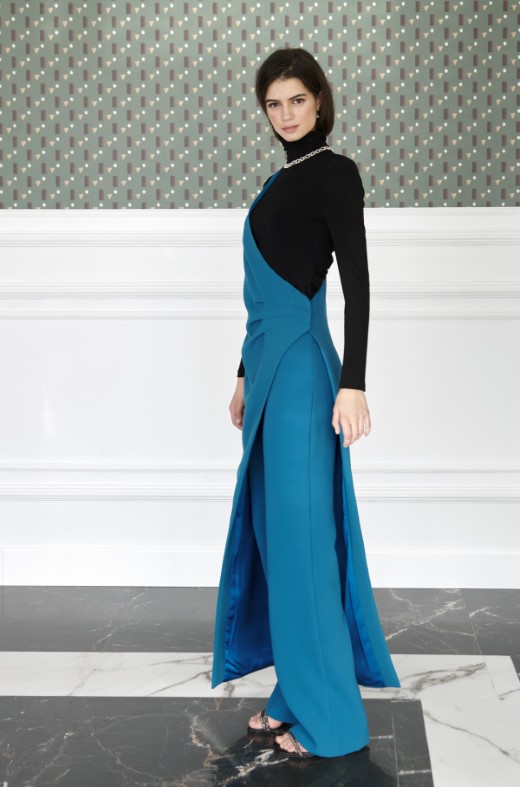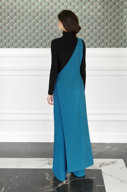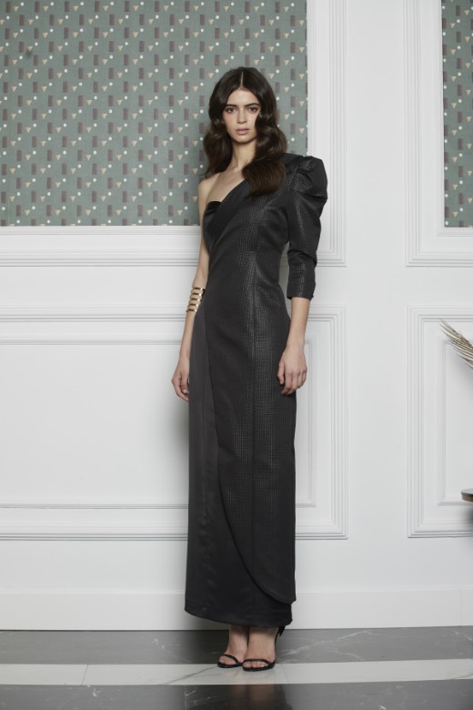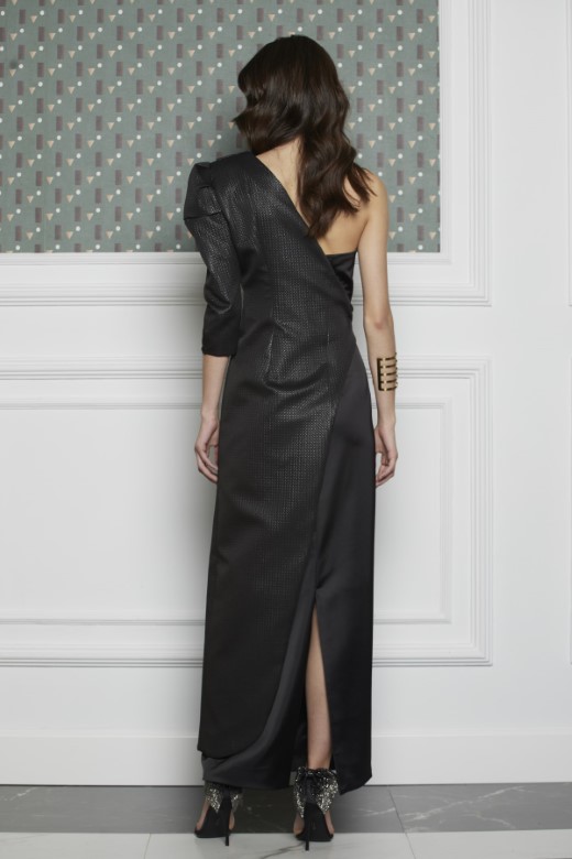 Su corte estructurado y hombros pronunciados aportan un toque vanguardista. El panel central con textura sutil realza la sofisticación del look.