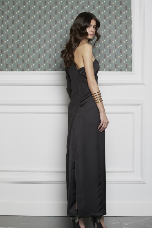 Este vestido largo de raso negro tiene un diseño entallado que realza la figura con elegancia.