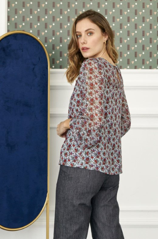 Blusa de corte entallado, escote redondo y lágrima en espalda rematado con un botón.