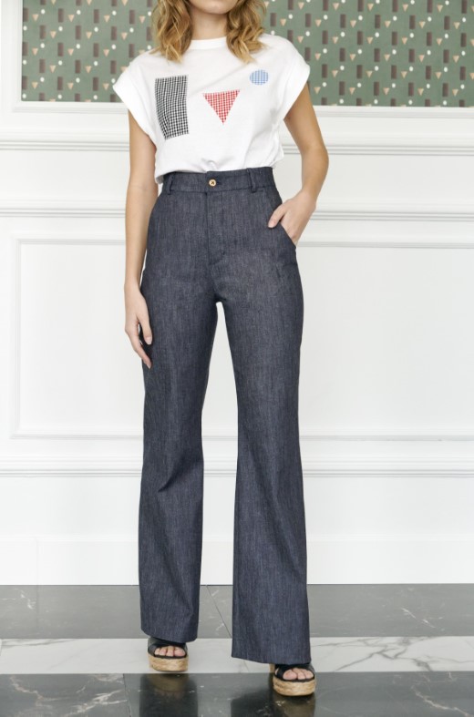 Pantalón de corte recto con cinturilla vista, cierre en espalda remataco con cremallera invisible.