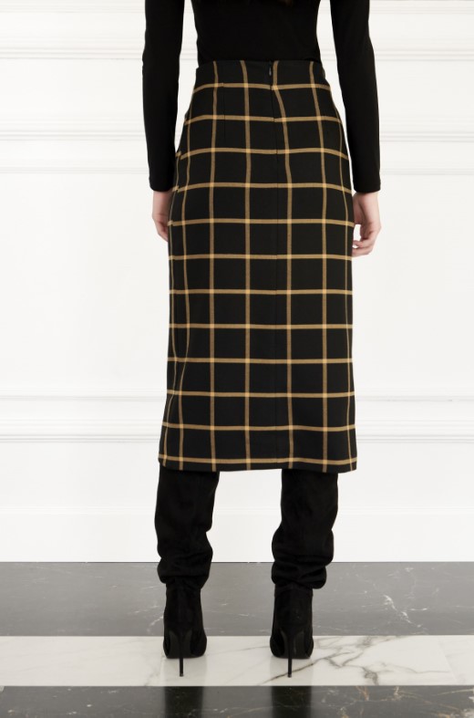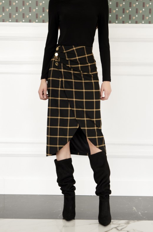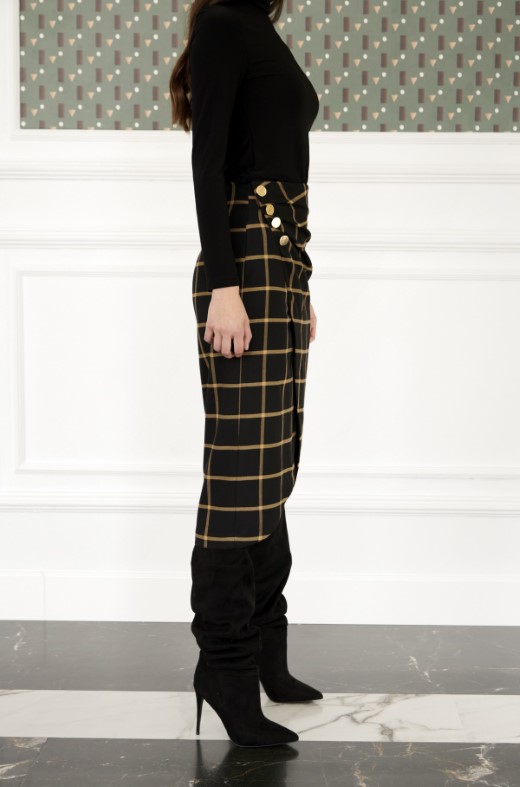 Falda midi asimétrica entallada, con estampado de cuadros, decorada con botones "Lanuya".