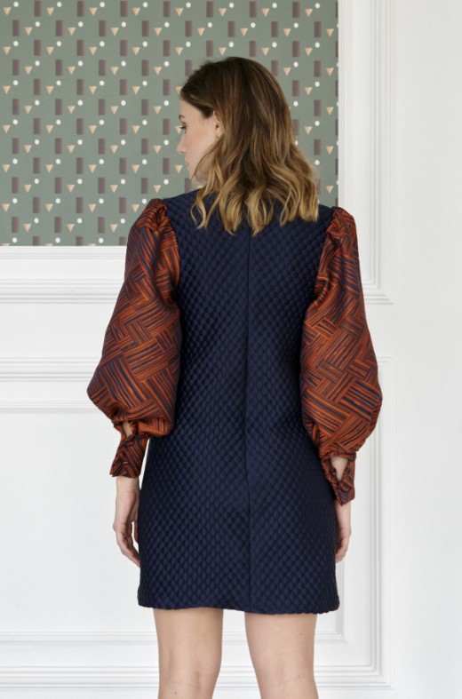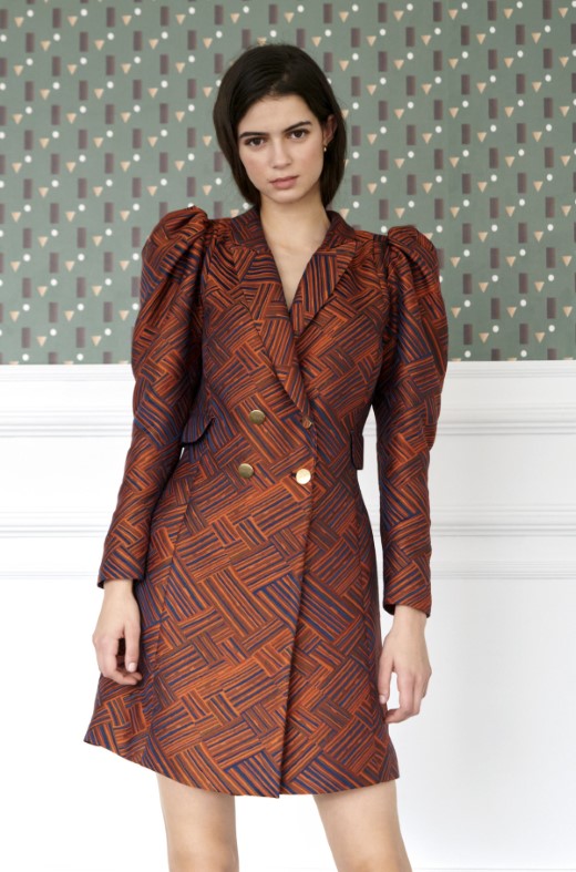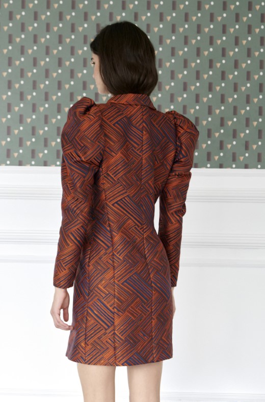 Vestido corto de doble botonadura con un llamativo estampado geométrico en tonos rojizos y azul oscuro.