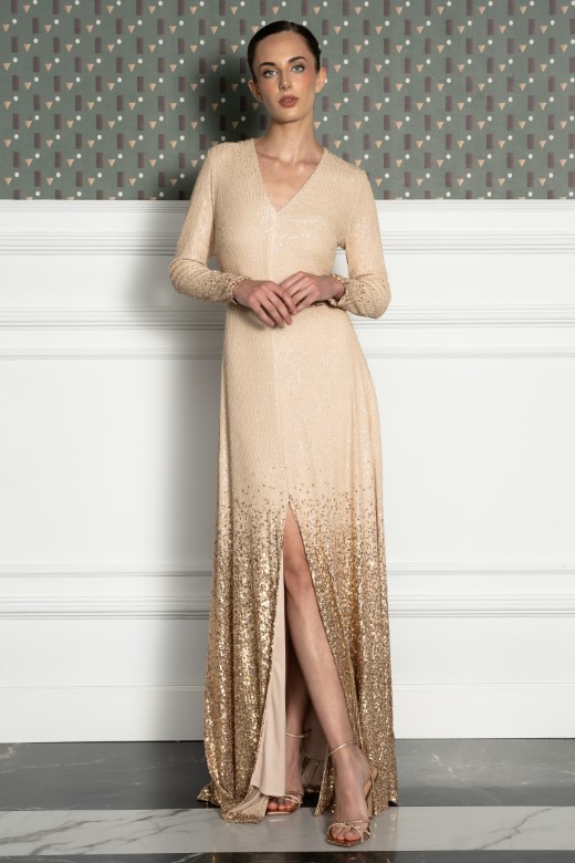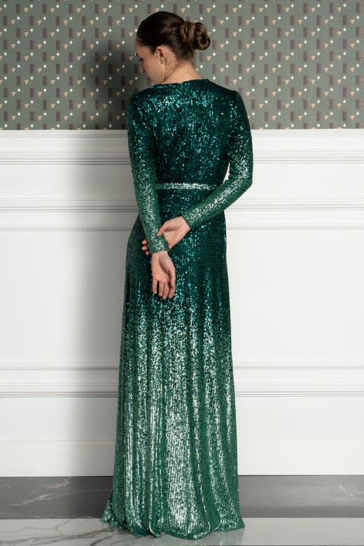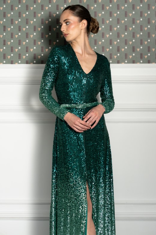 Presenta cierre frontal con abertura delantera y un degradado de color dorado/verde con detalles brillantes.