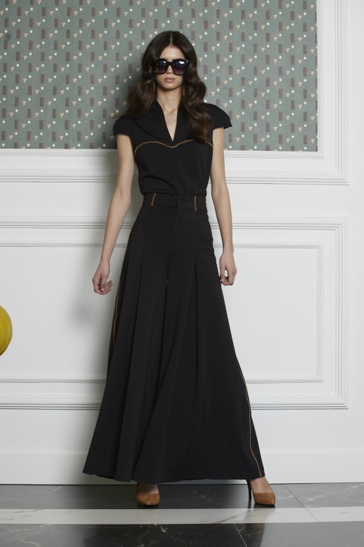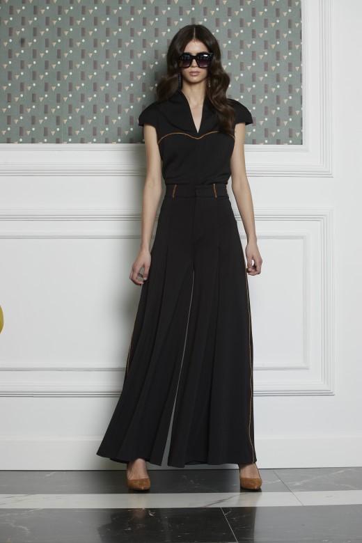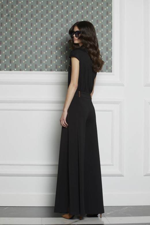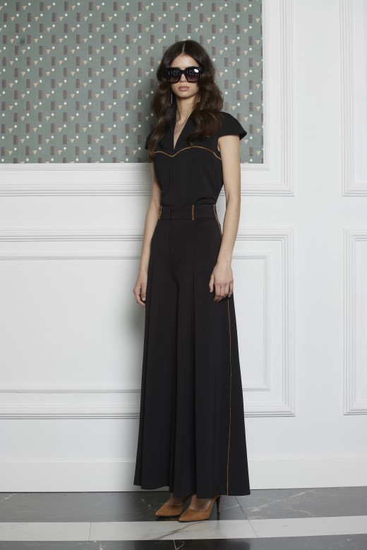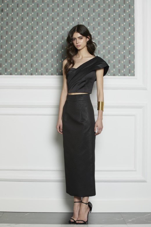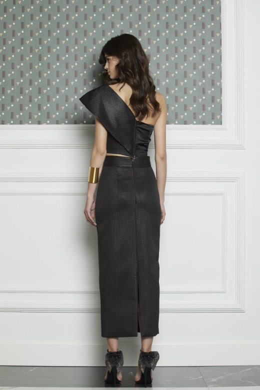 Confeccionado en material negro texturizado y de corte ajustado, resalta la silueta.