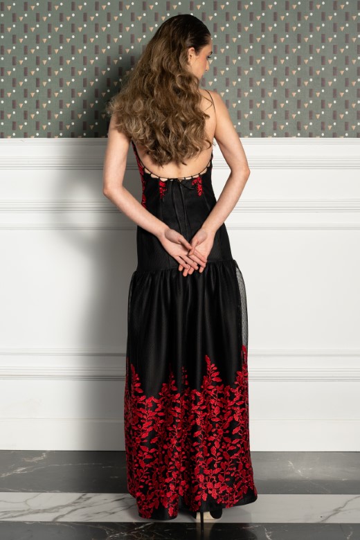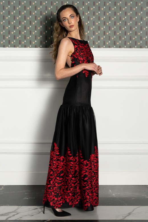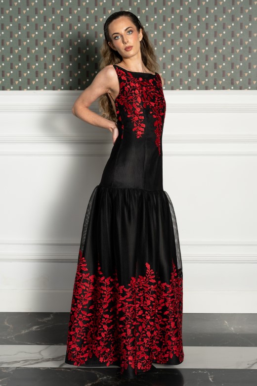 Vestido largo y elegante con diseño simétrico en la parte superior y detalles florales rojos bordados.