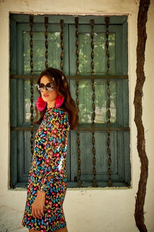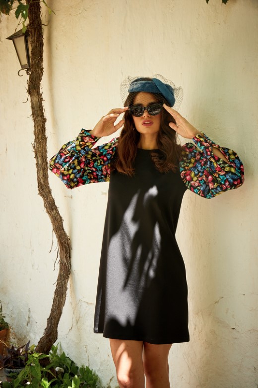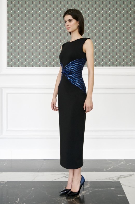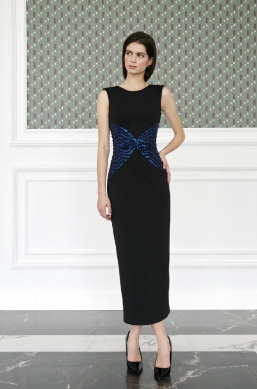 Vestido midi entallado con decoración de lentejuelas en cintura con forma de mariposa. Cuello a la caja y rematado con cremallera invisible en la espalda.