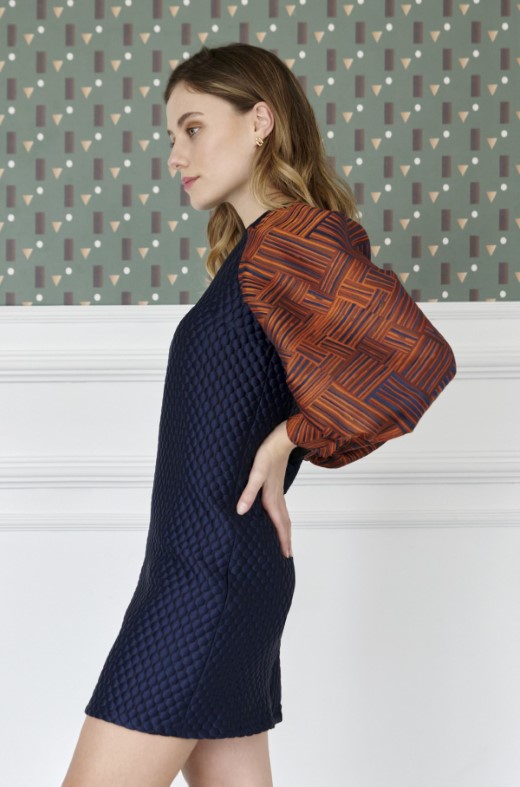 Juego de contrastes de color y combinación de texturas entre las mangas y el cuerpo.