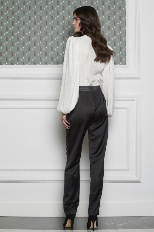 Pantalón negro de raso, tiene un diseño pitillo que se ajusta a las piernas, creando una silueta estilizada.