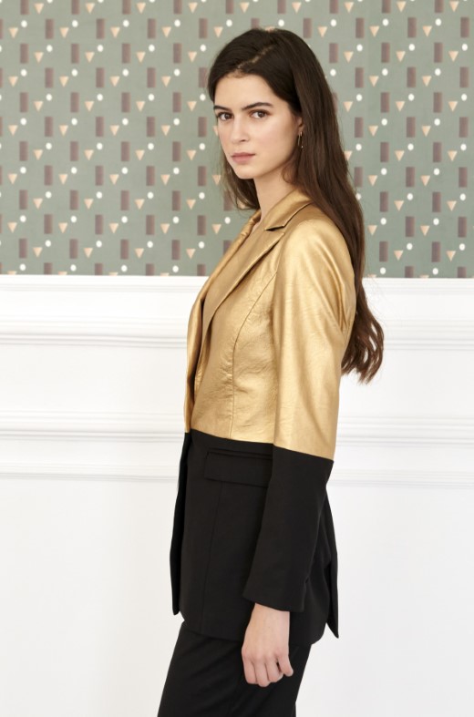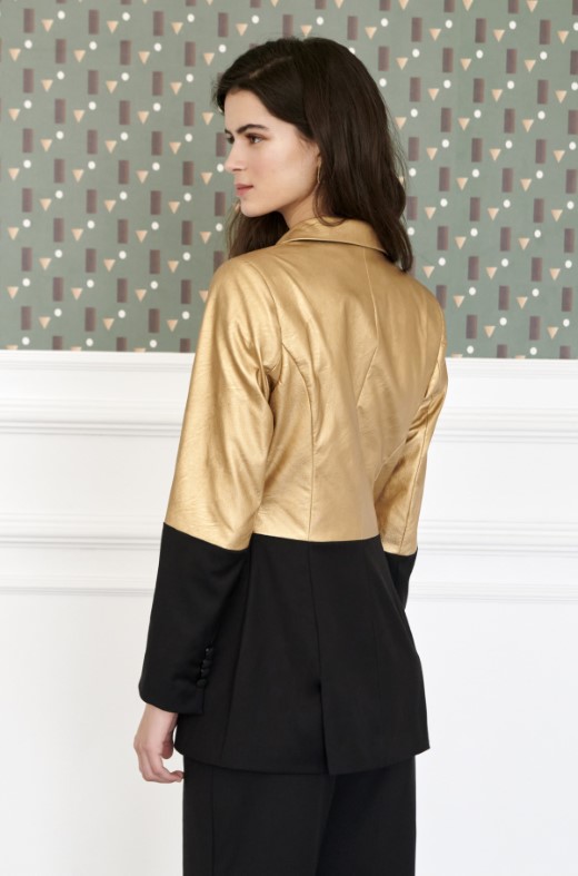 Blazer de diseño bicolor confeccionada en dos tejidos: la parte superior en dorado brillante y la inferior en negro elegante.