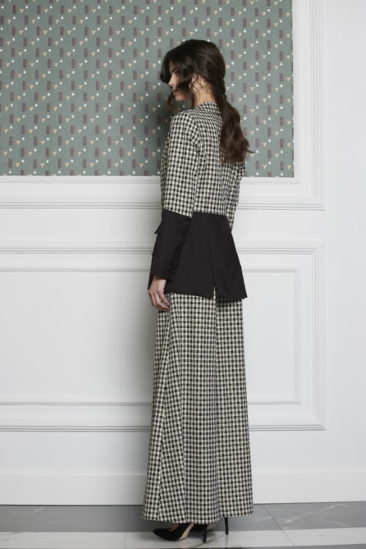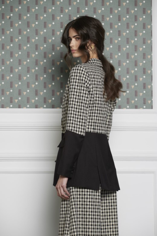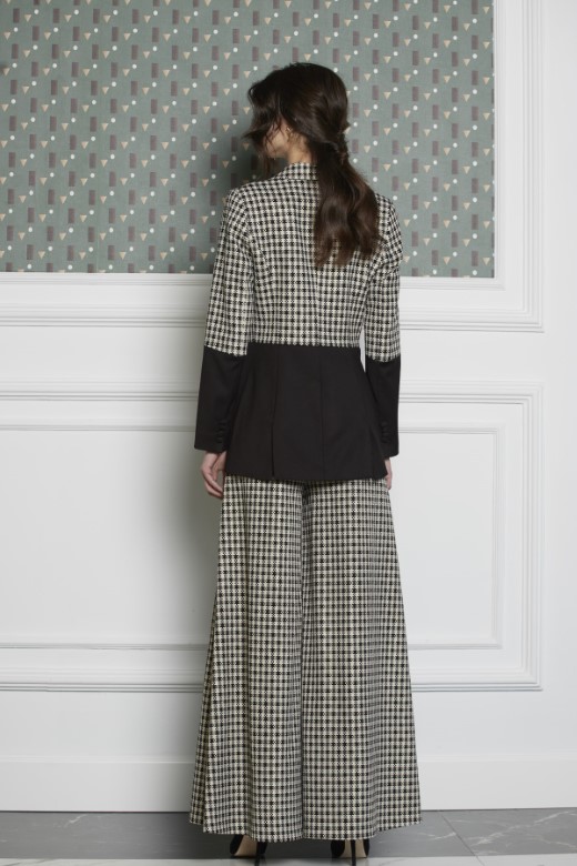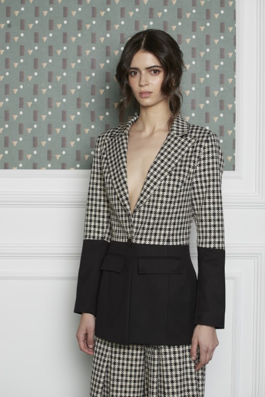Blazer de diseño bicolor confeccionada en dos tejidos: la parte superior en estampado de cuadros y la inferior en negro elegante.
