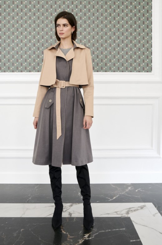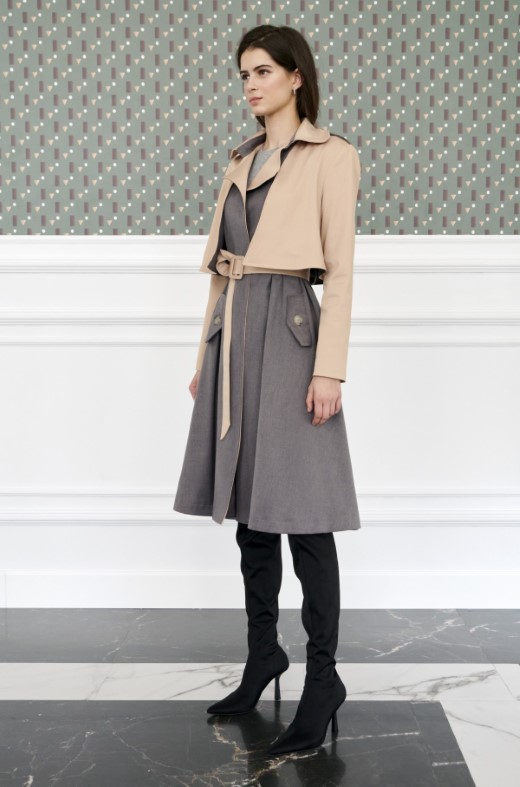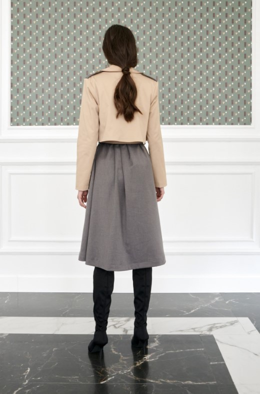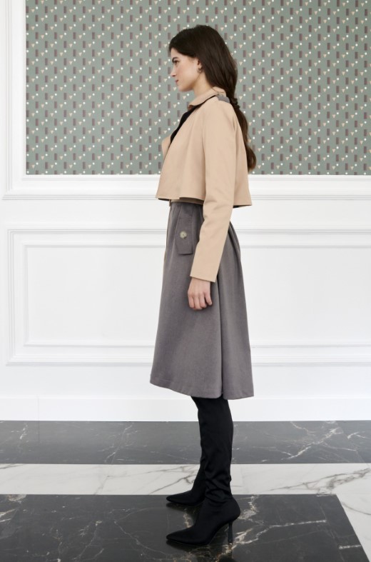 Gabardina bicolor con parte superior corta en beige y parte inferior en gris oscuro con bolsillos decorativos.