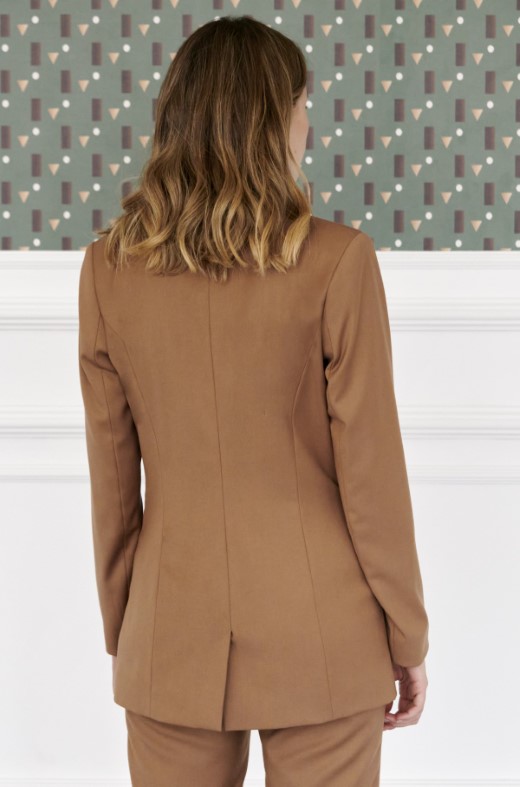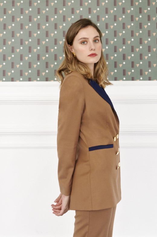 Chaqueta larga de estilo cruzado en color camel, con solapas en contraste de color azul oscuro.