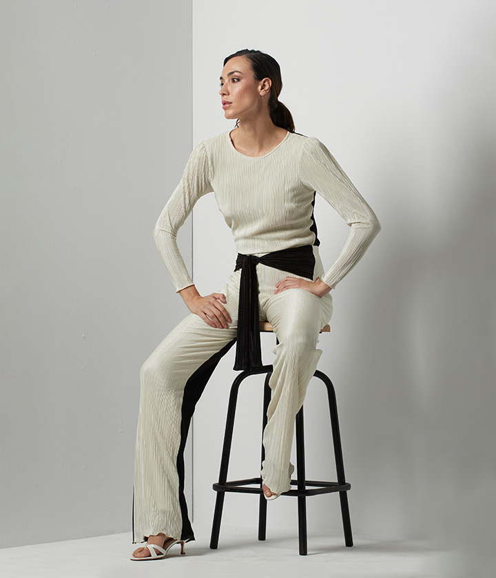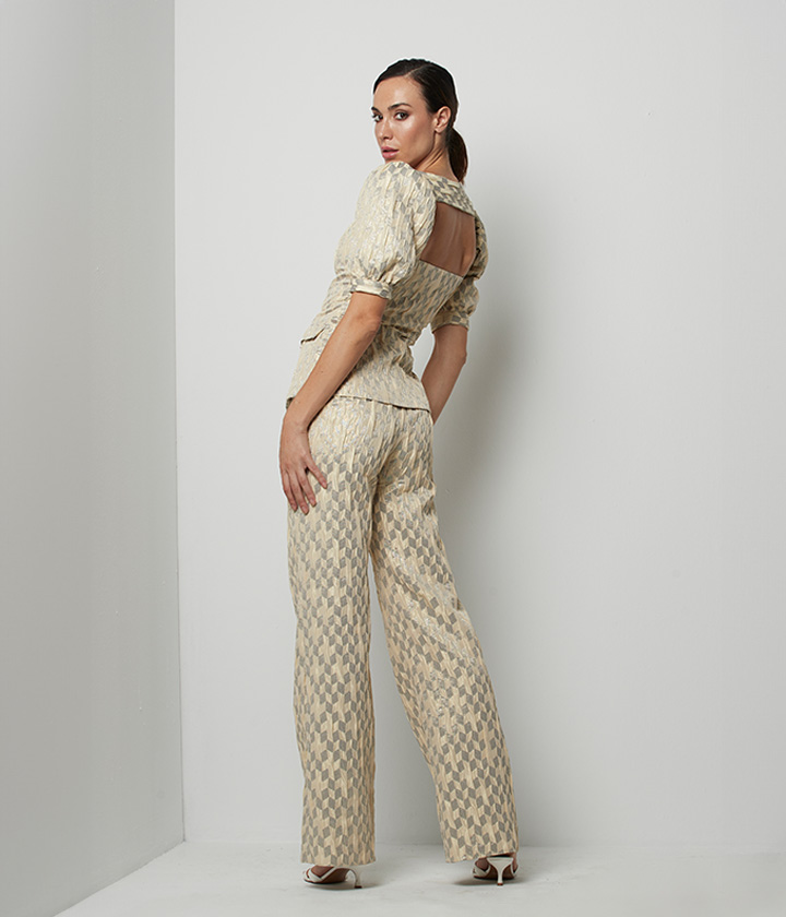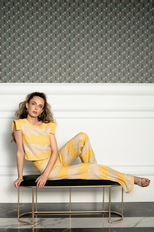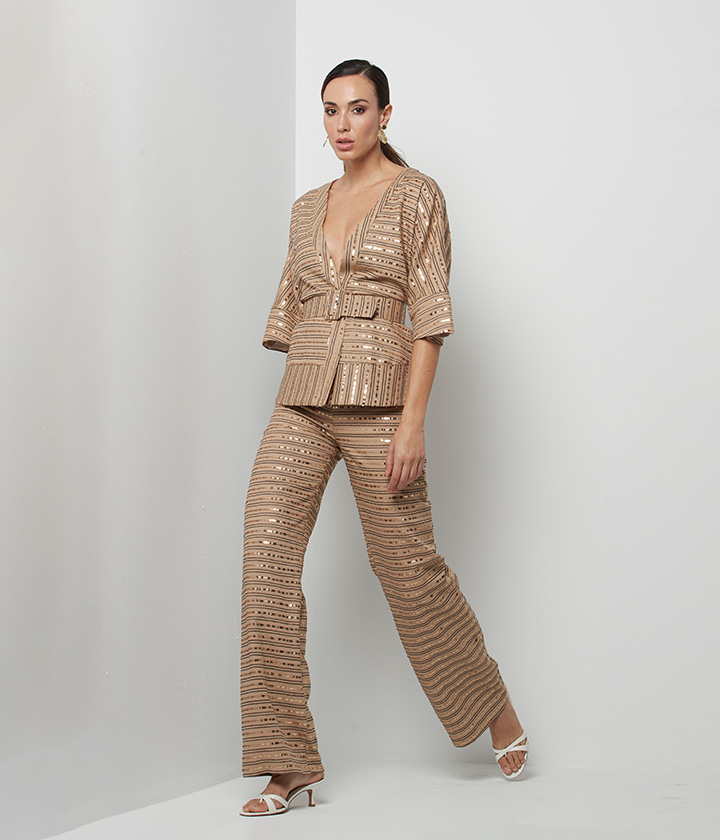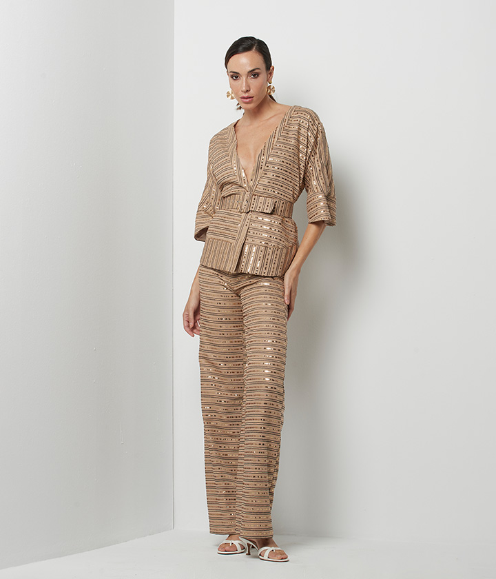 Destaca por su patrón de rayas horizontales adornado con delicados bordados de lentejuelas doradas que le confieren un toque de lujo y sofisticación. El corte recto y amplio de las piernas aporta aire moderno y favorecedor, mientras que la cintura alta estiliza la figura.