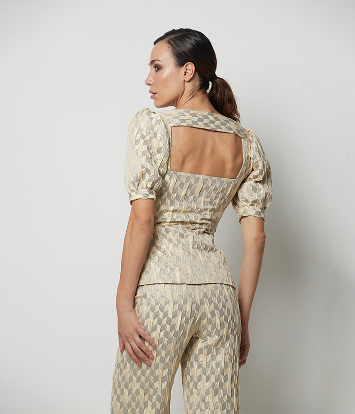 Destaca por su diseño moderno y sofisticado, con escote cuadrado, hombros ligeramente estructurados y mangas abullonadas que aportan un toque romántico. La silueta entallada realza la figura y los botones frontales añaden un detalle clásico.