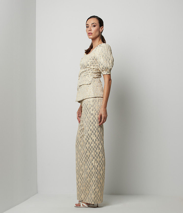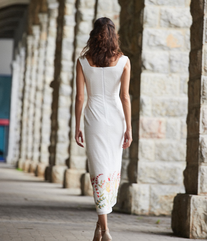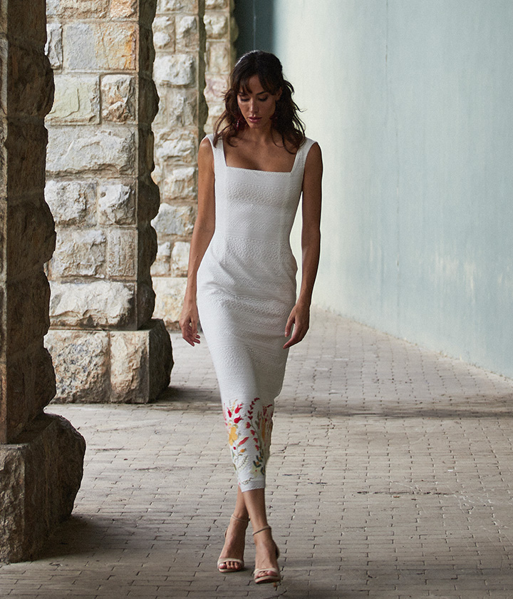 Destaca por su diseño estructurado con talle alto que define la cintura y una silueta lápiz que estiliza la figura. El bordado floral crea un efecto visualmente impactante y añade un toque de sofisticación y lujo.