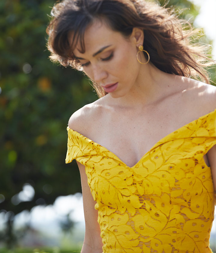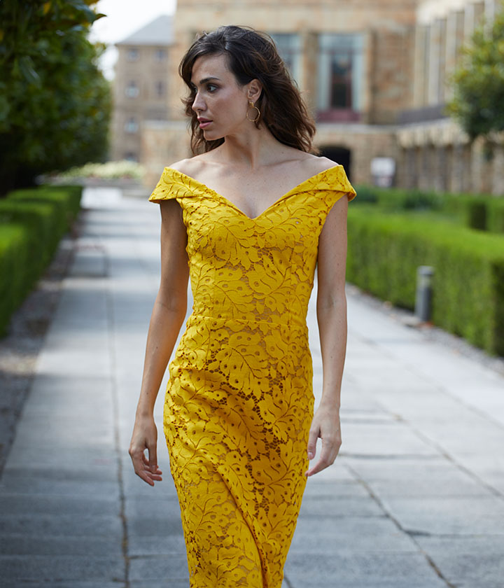 Vestido midi de encaje amarillo con blonda en el bajo.
