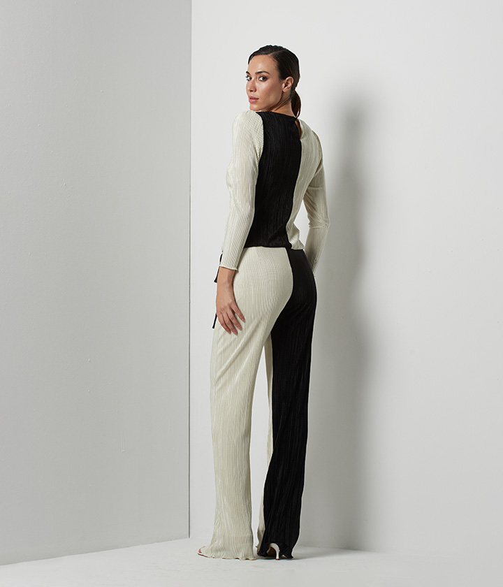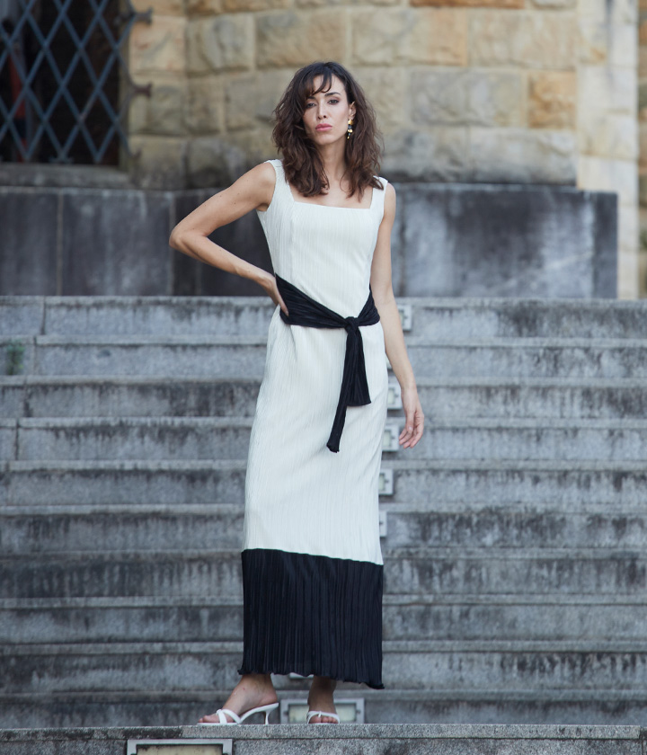 La parte superior, de color blanco, presenta un escote cuadrado y un corte recto. La falda, en color negro, cuenta con tejido plisado que le otorga movimiento.