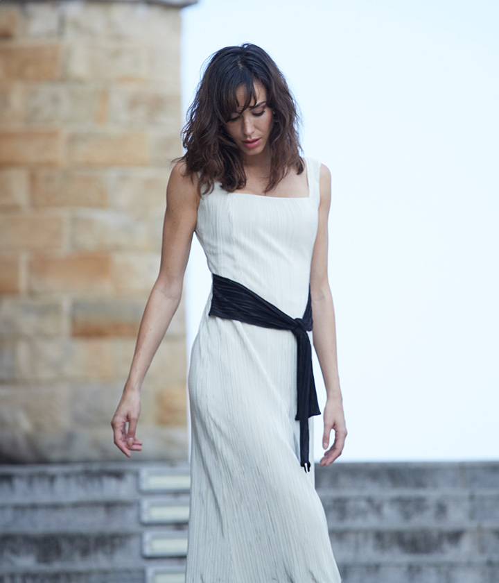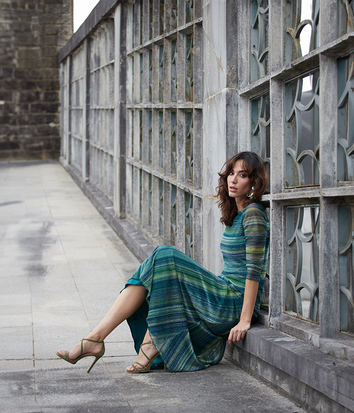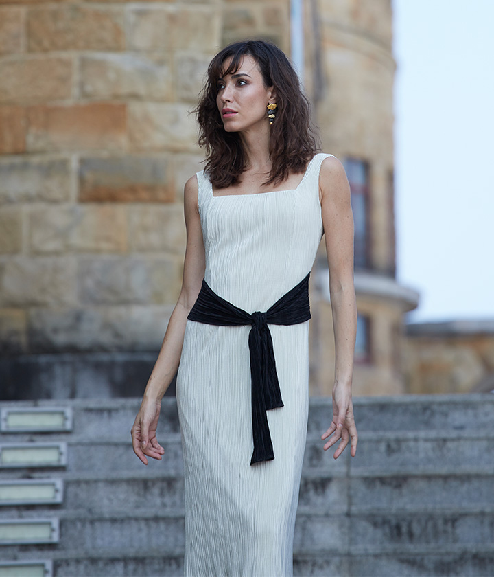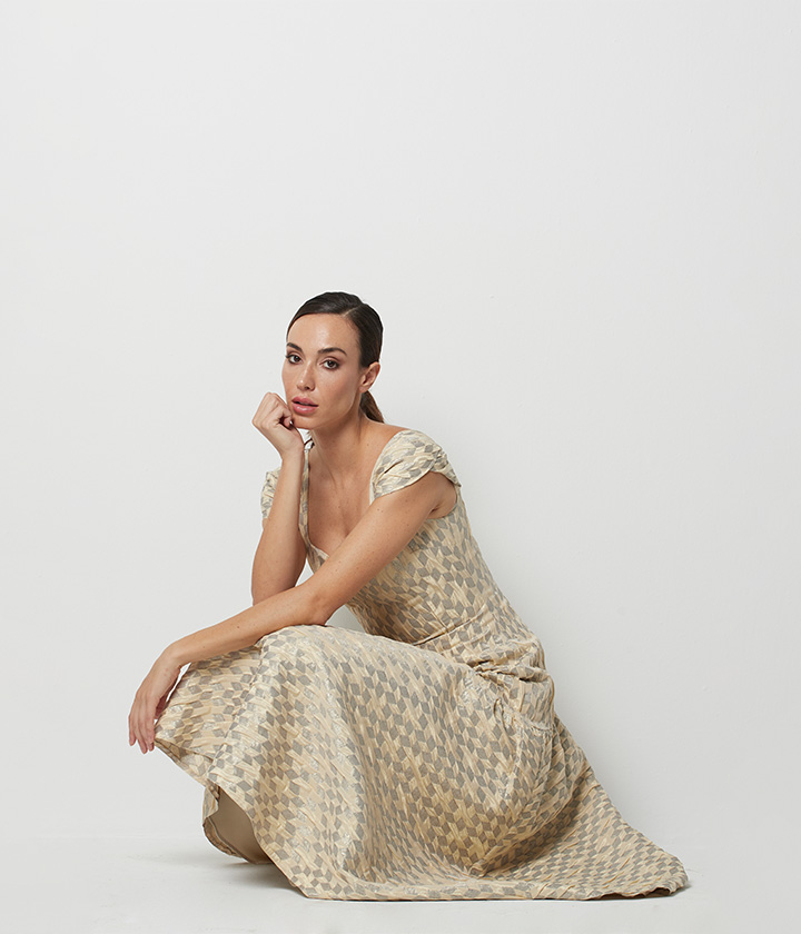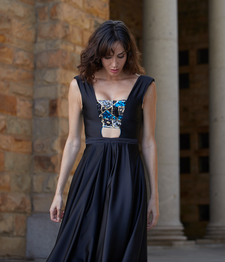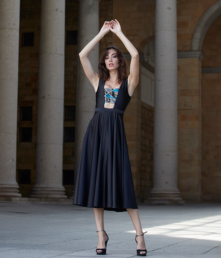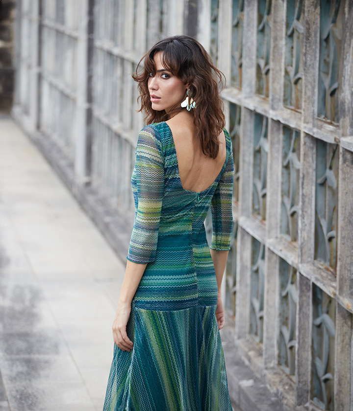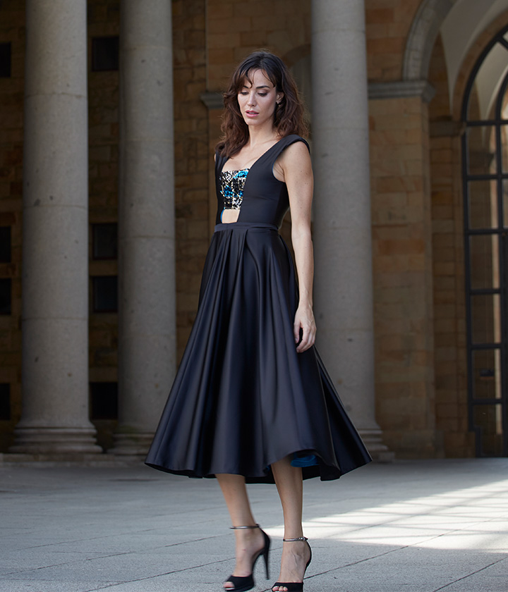 Destaca por su escote barco que favorece la zona del cuello y hombros, y por su falda evasé que aporta movimiento y fluidez.