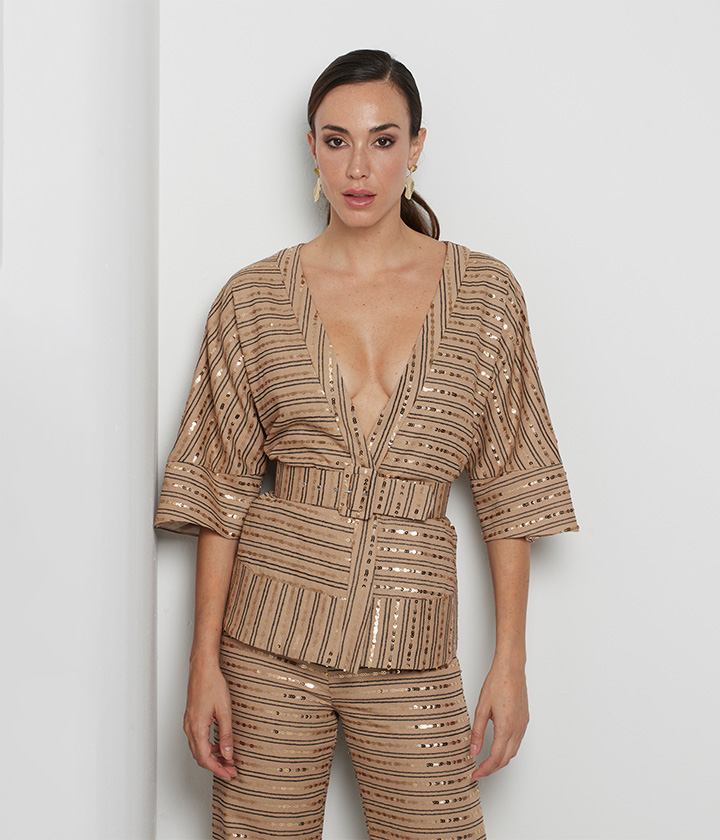 Chaqueta corta confeccionada en tejido de color marrón, adornada con delicados bordados de lentejuelas doradas que crean un patrón geométrico.