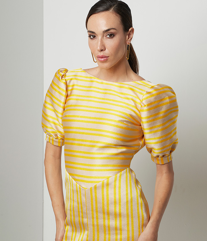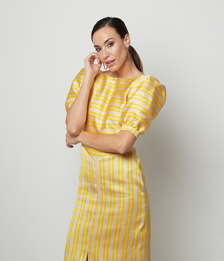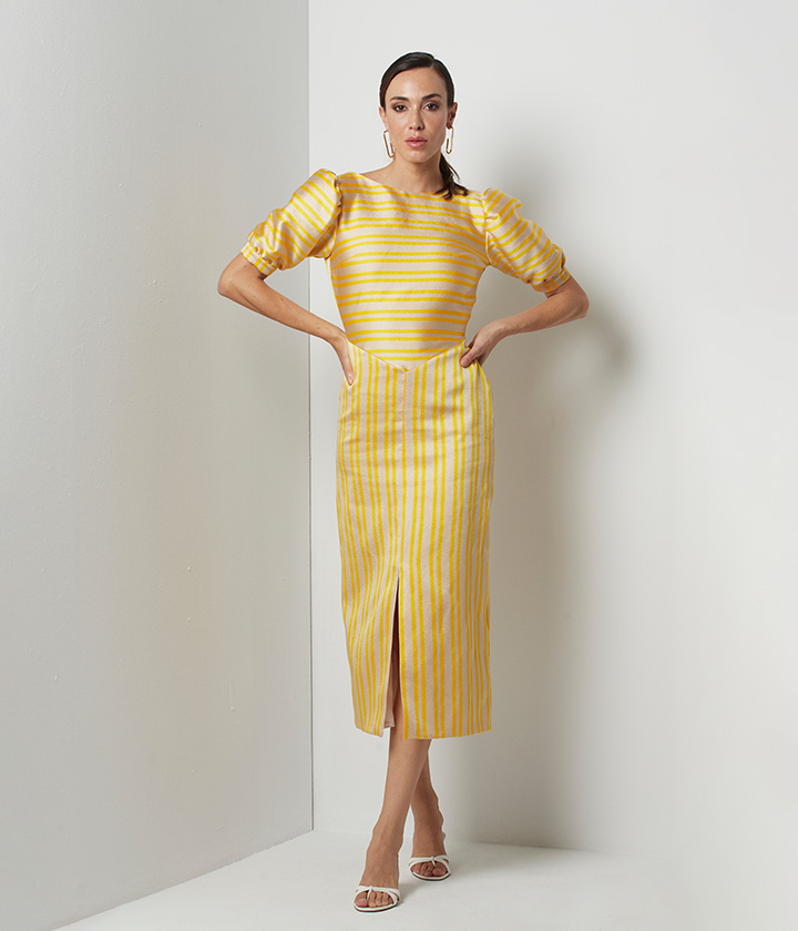 Elegante vestido midi confeccionado en tejido de alta calidad con vibrante estampado de rayas amarillas y beige.