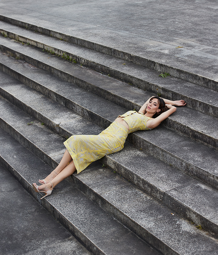 Destaca por su patrón de rayas horizontales en contraste, con tejido base de color beige y delicadas aplicaciones de encaje amarillo que le aportan un toque femenino y romántico.