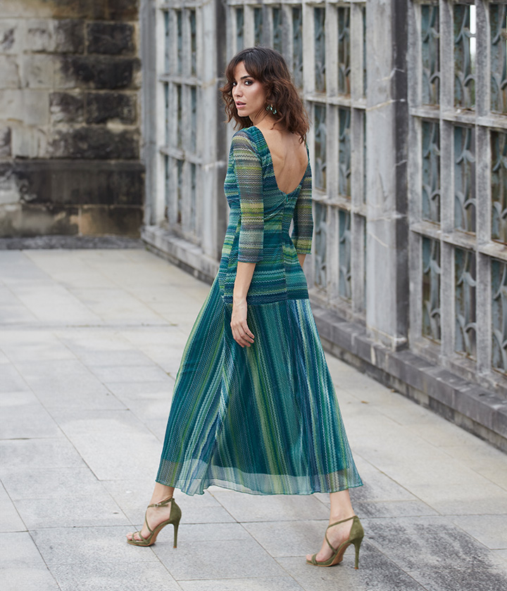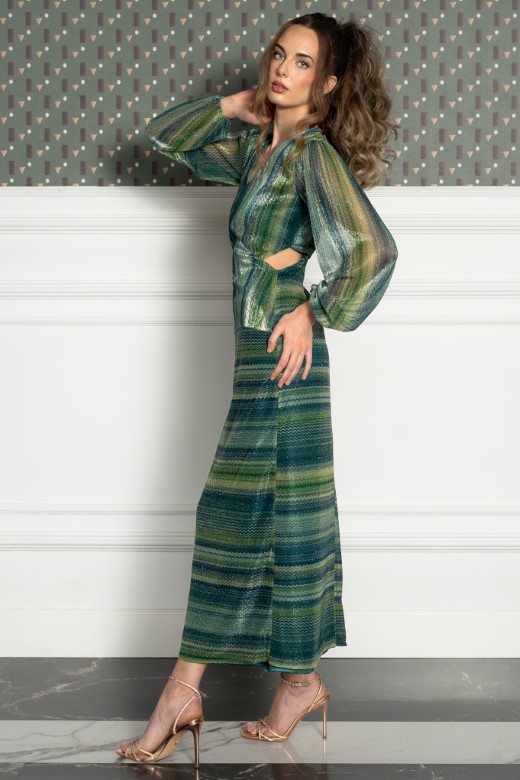 Vestido midi confeccionado en tejido de punto metalizado con lamativo diseño de rayas en tonos verdes y plateados.