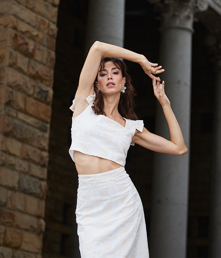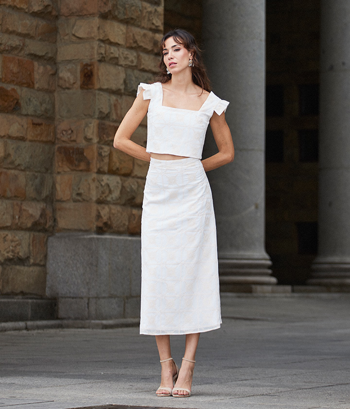 Top de corte crop confeccionada en tejido ligero y natural, con un diseño inspirado en la tradición artesanal.