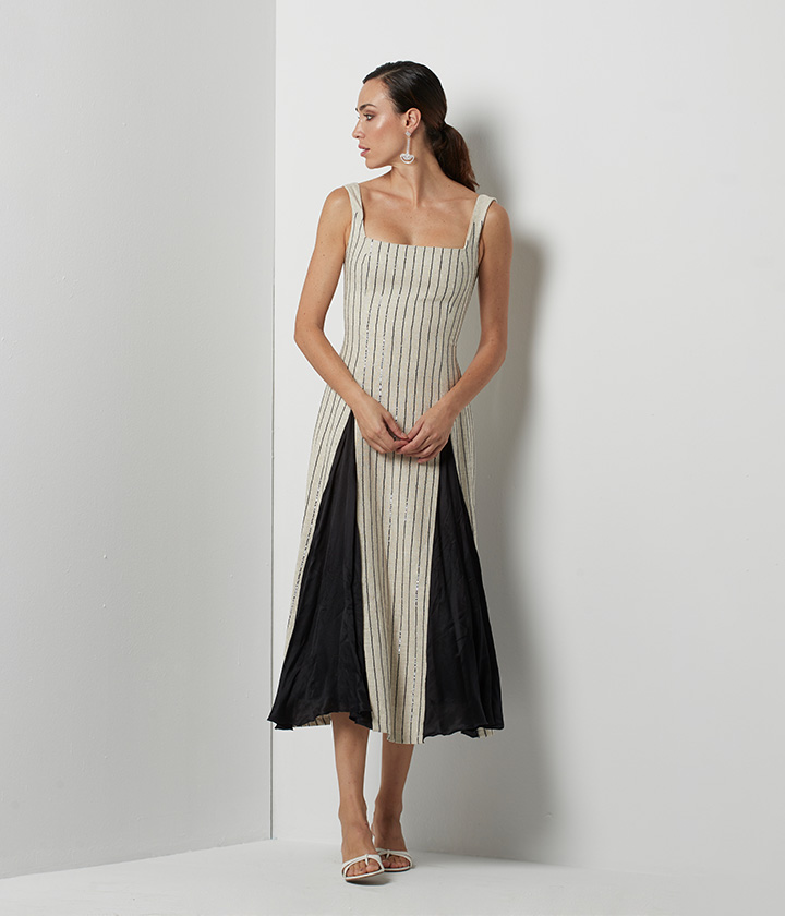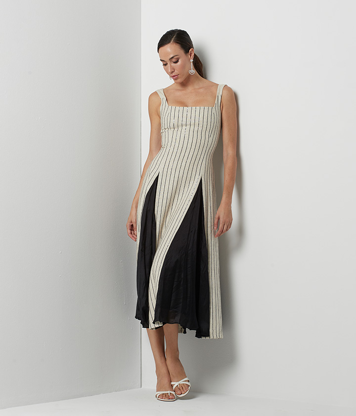 Vestido midi confeccionado en tejido de alta calidad con un llamativo diseño de rayas verticales en blanco y negro.