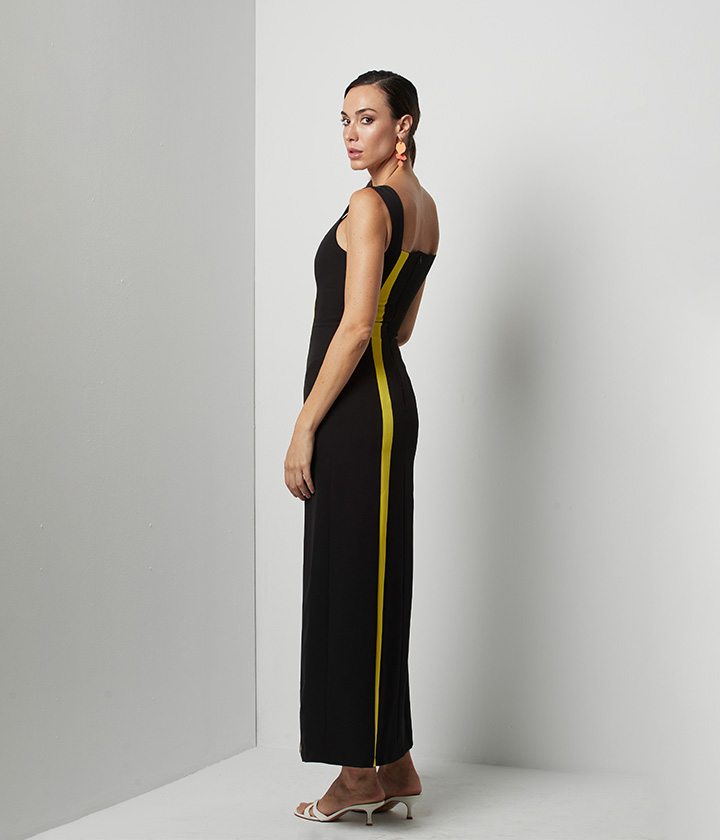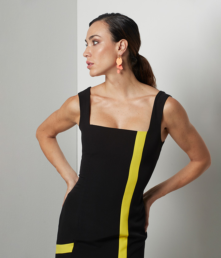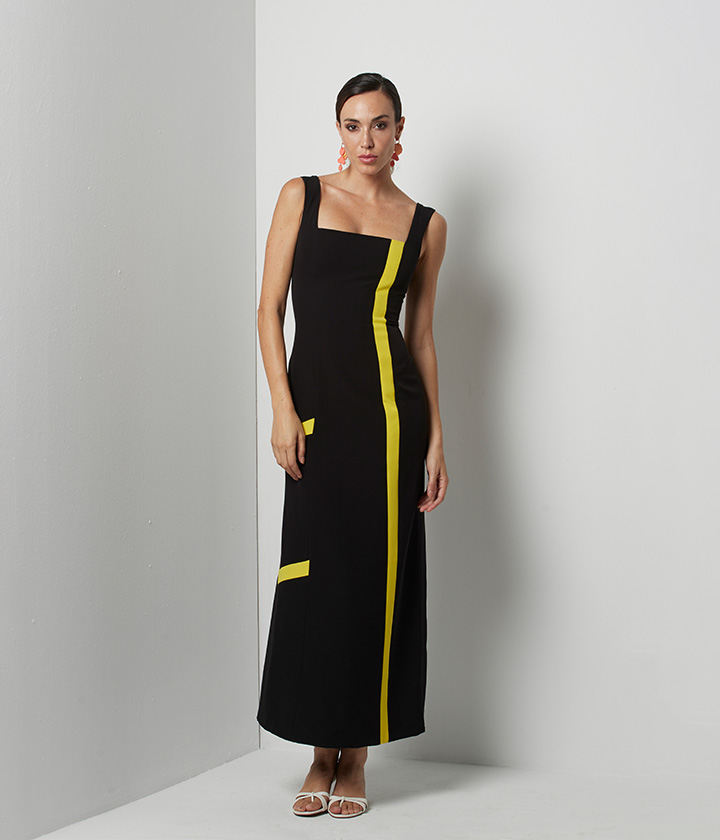 Vestido midi confeccionado en tejido de alta calidad, predominantemente negro, con llamativos detalles en color amarillo neón.
