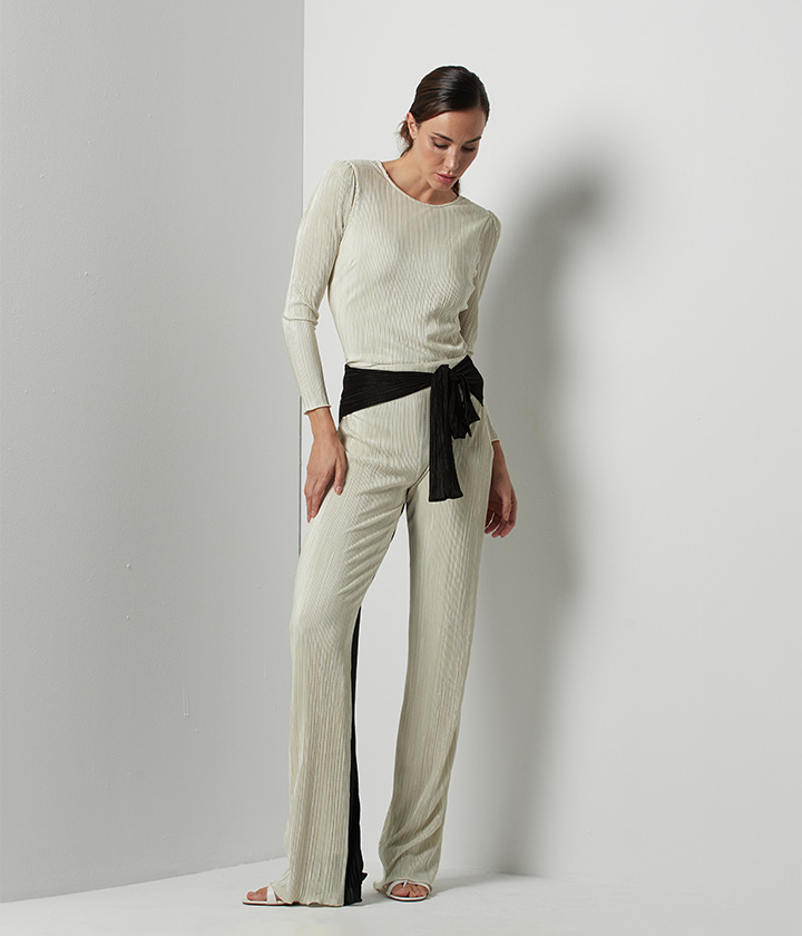 Pantalón palazzo confeccionado en tejido fluido y ligero, con diseño innovador y sofisticado.