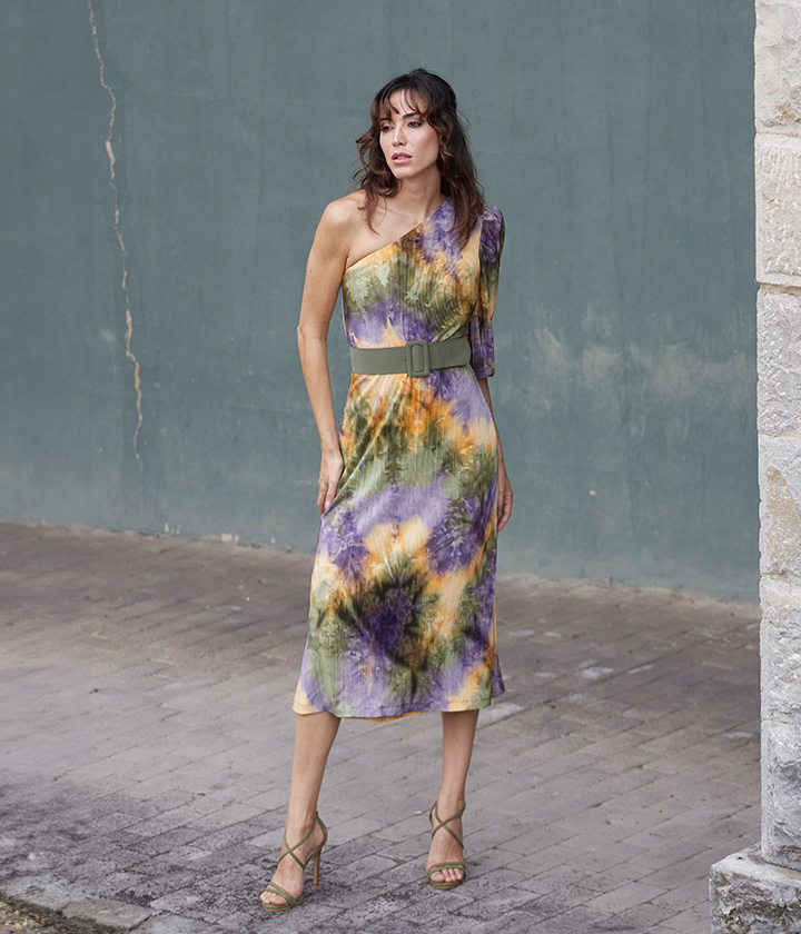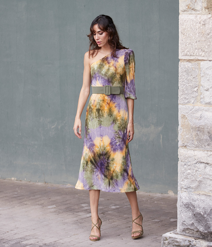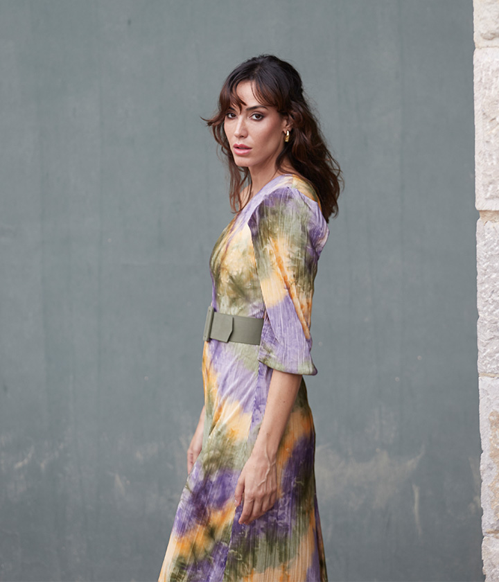 Vestido midi confeccionado en tejido suave y fluido con estampado tie-dye en tonos morados, verdes y amarillos.