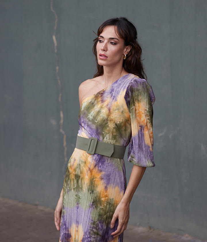 Destaca por su diseño asimétrico, con una manga abullonada y hombro descubierto, que le otorga un toque moderno y sofisticado. El tejido plisado añade movimiento y textura, creando un efecto visual muy favorecedor.