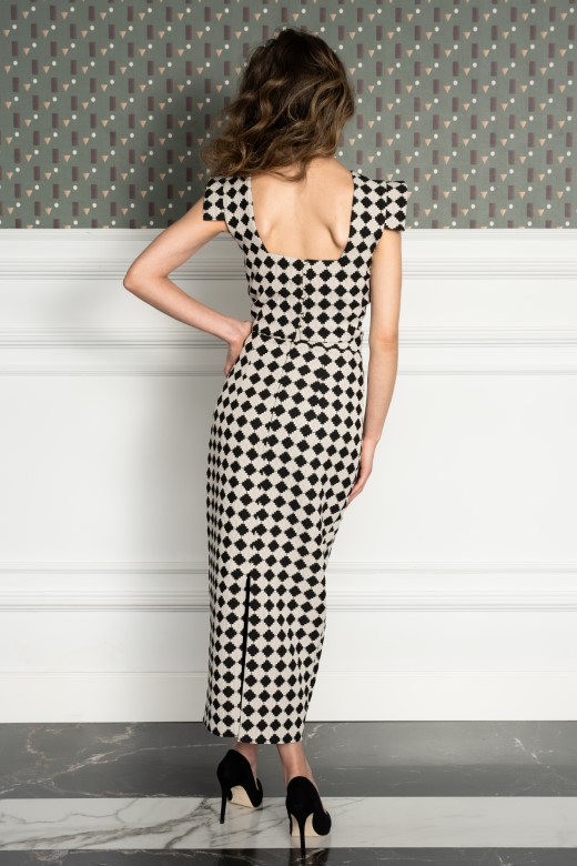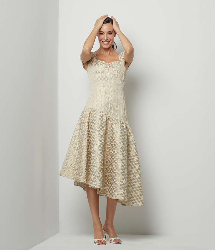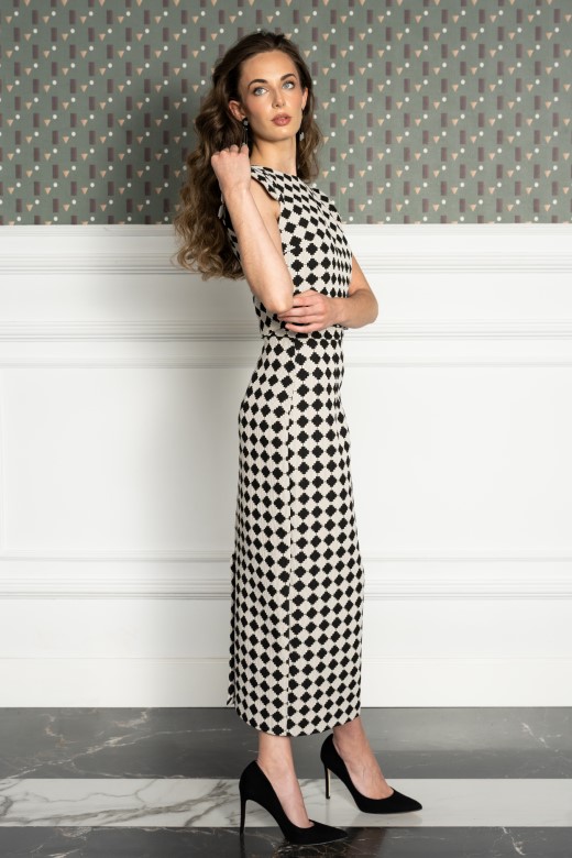 Vestido midi confeccionado en tejido estructurado con patrón geométrico que crea un efecto visual sofisticado.