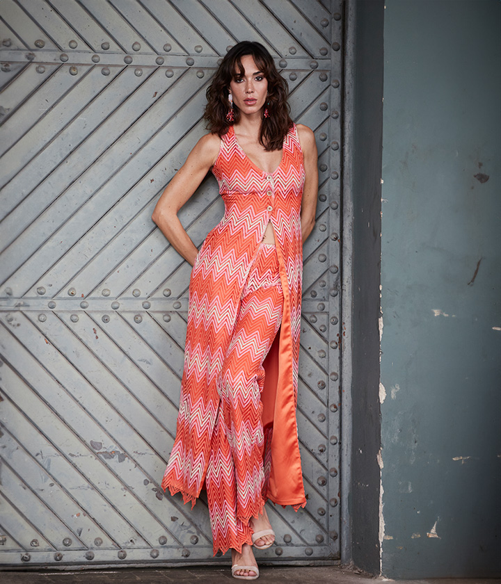 Chaleco confeccionado en tejido de punto de viscosa con un patrón de chevron en tonos de coral y rosa.