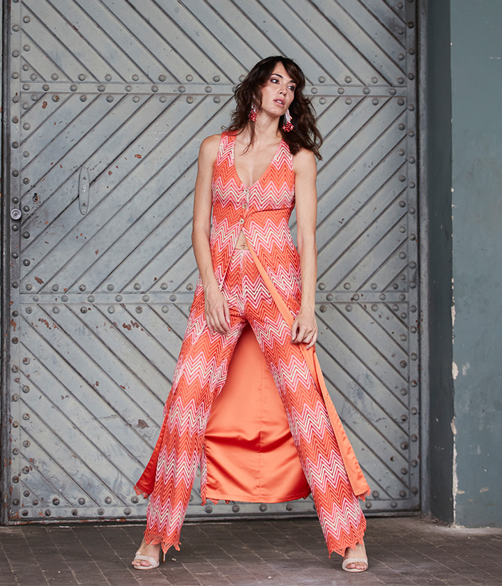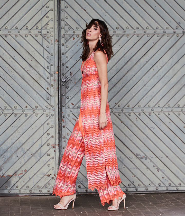 Pantalón palazzo confeccionado en tejido de punto de viscosa con un patrón de chevron en tonos de coral y rosa.