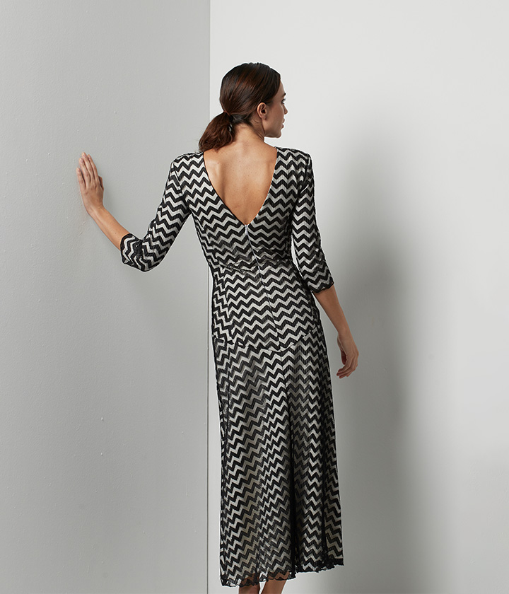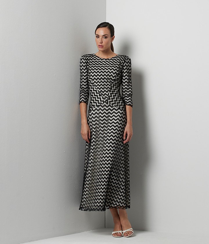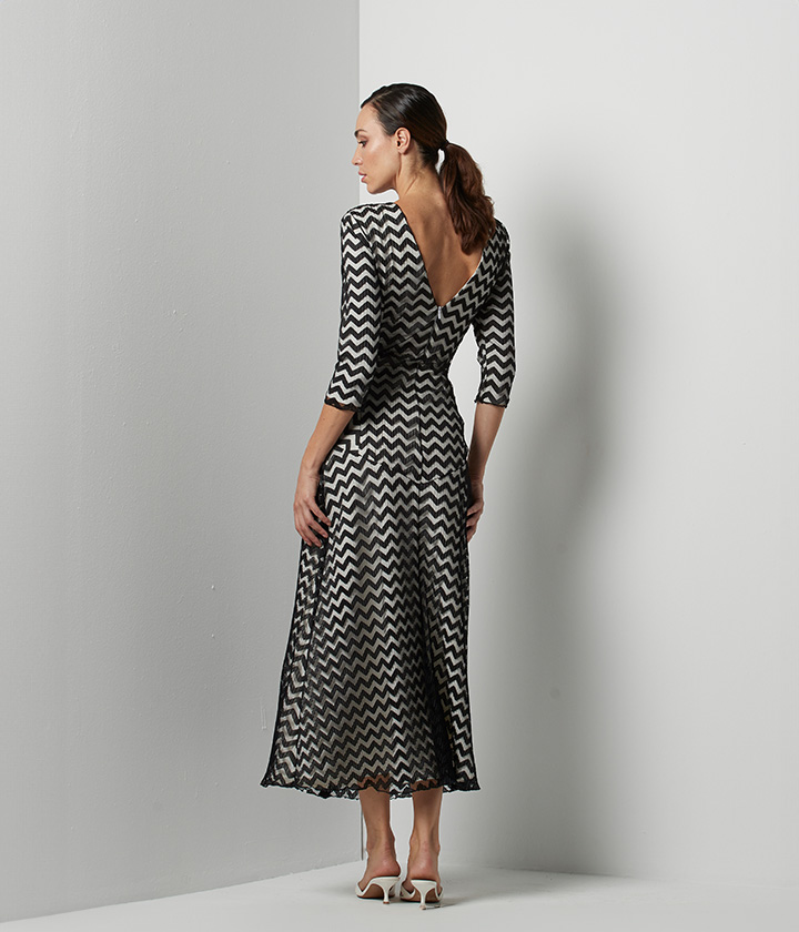 Vestido midi confeccionado en tejido de malla con un llamativo patrón de chevron en blanco y negro.