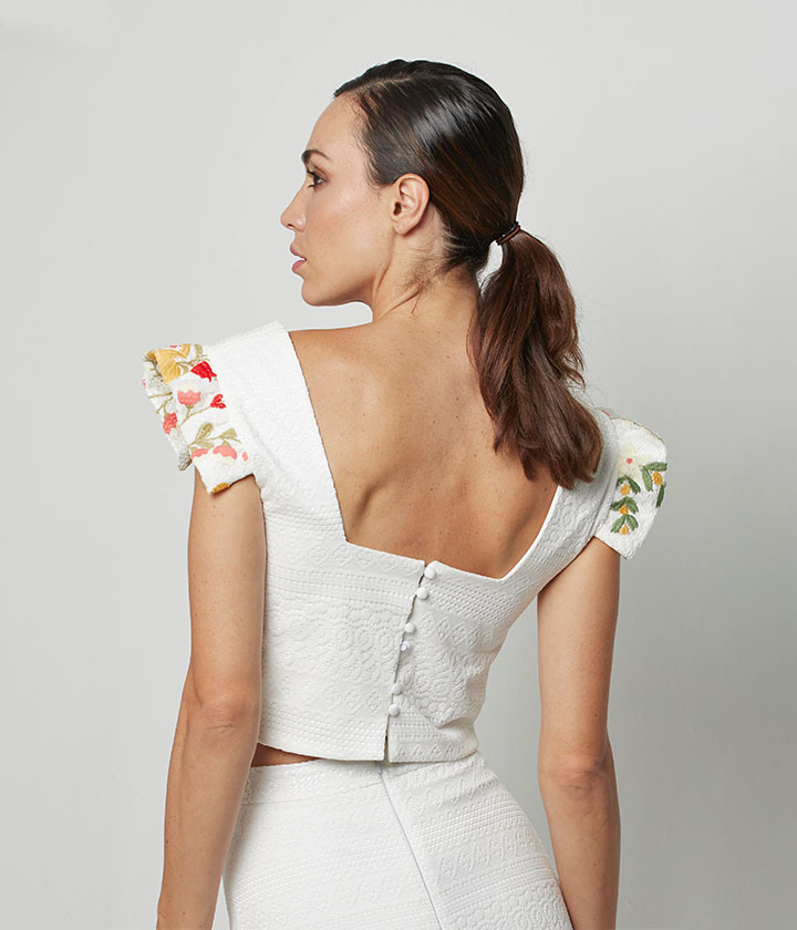 Top corto confeccionado en tejido de alta calidad con ligero brillo, adornado con delicado bordado de flores en tonos oscuros sobre fondo blanco.