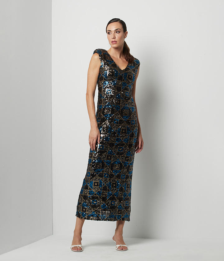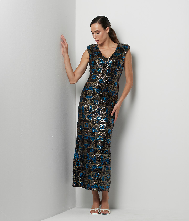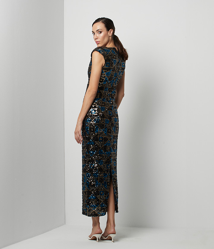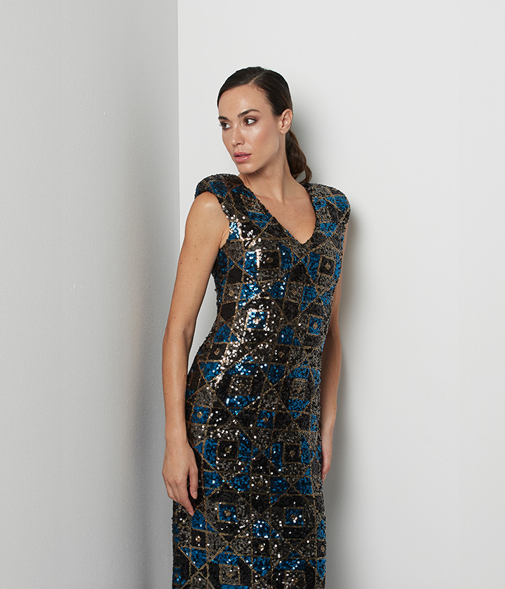 Vestido midi confeccionado en tejido de lentejuelas, con diseño geométrico en tonos azules y dorados que crea un efecto visual impactante.