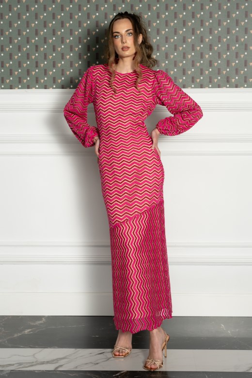 Vestido midi confeccionado en tejido de punto de canalé con un llamativo patrón de chevron en tonos rosados.