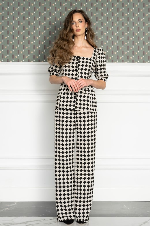 Pantalón de pierna ancha confeccionado en tejido de punto con llamativo patrón en blanco y negro.